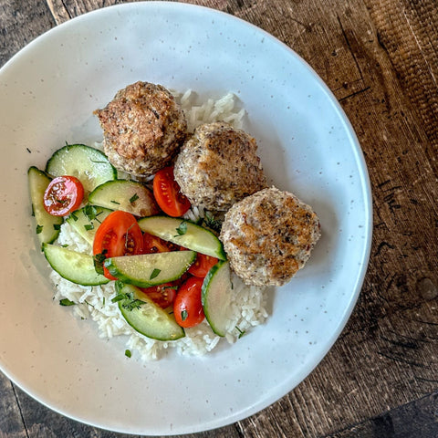 - While the meatballs cook, mix the rice with lemon juice, parsley, tomatoes, cucumber and salt.