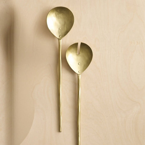 Whether serving fruit or greens, these hammered steel and brass utensils do it with style. Rounded fork and spoon ends with long, tapered handles.
